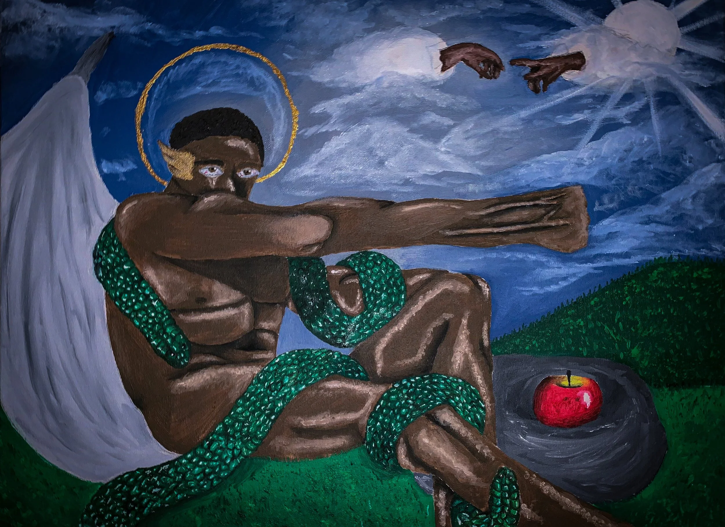 Rather than portraying Lucifer as a flat symbol of wickedness, this piece presents him as a complex and powerful figure. By depicting him as a Black man, the painting opens dialogue about how race, bias, and cultural narratives influence the way society assigns meaning to certain images. It challenges viewers to reflect on why certain representations feel familiar and others feel controversial.